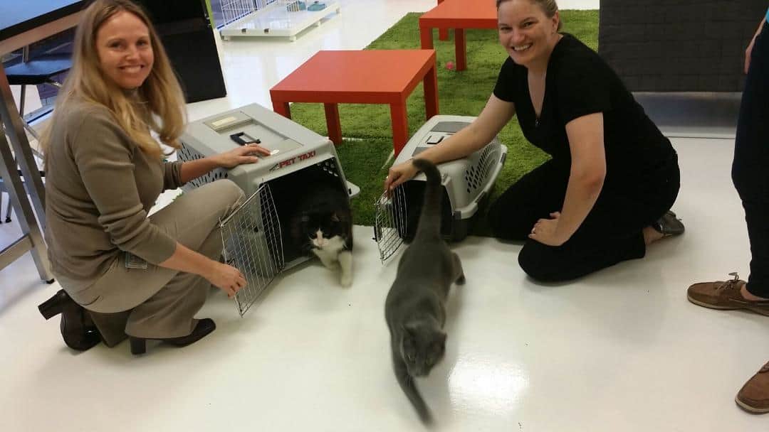 Animal shelter director Darcy Andrade and Planet Tails owner Ericka Bastile welcome the first kitties to the cat cafe: